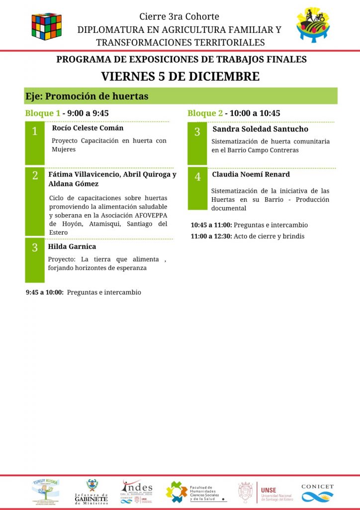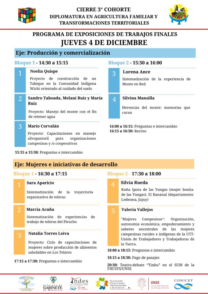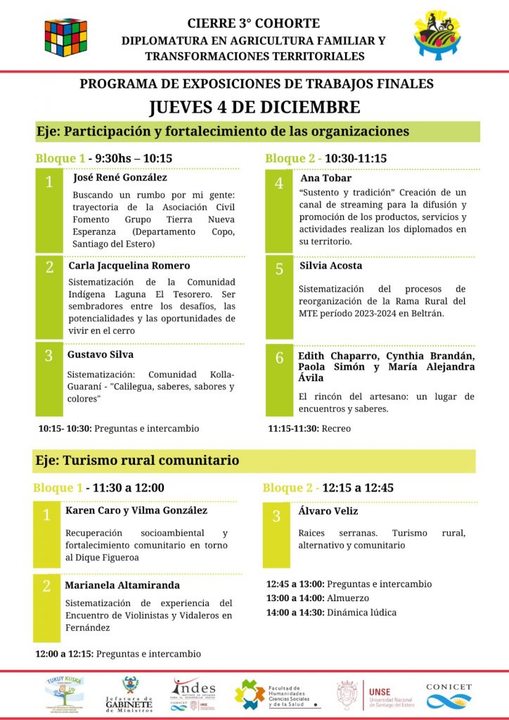 Los días jueves 4 y viernes 5 de diciembre, desde las 9 h, se llevará a cabo en el Aula A (UNSE Central) el encuentro de cierre correspondiente a la tercera cohorte de la diplomatura, en el que las y los cursantes compartirán sus trabajos finales, experiencias y aprendizajes construidos a lo largo del trayecto formativo.