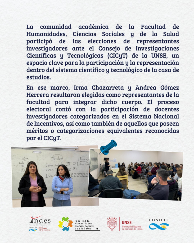 Estamos orgullosos de anunciar que las doctoras Irma Chazarreta y Andrea Gómez Herrera, integrantes de nuestro instituto, han sido electas como representantes ante el CICyT-UNSE por la Facultad de Humanidades, Ciencias Sociales y de la Salud.