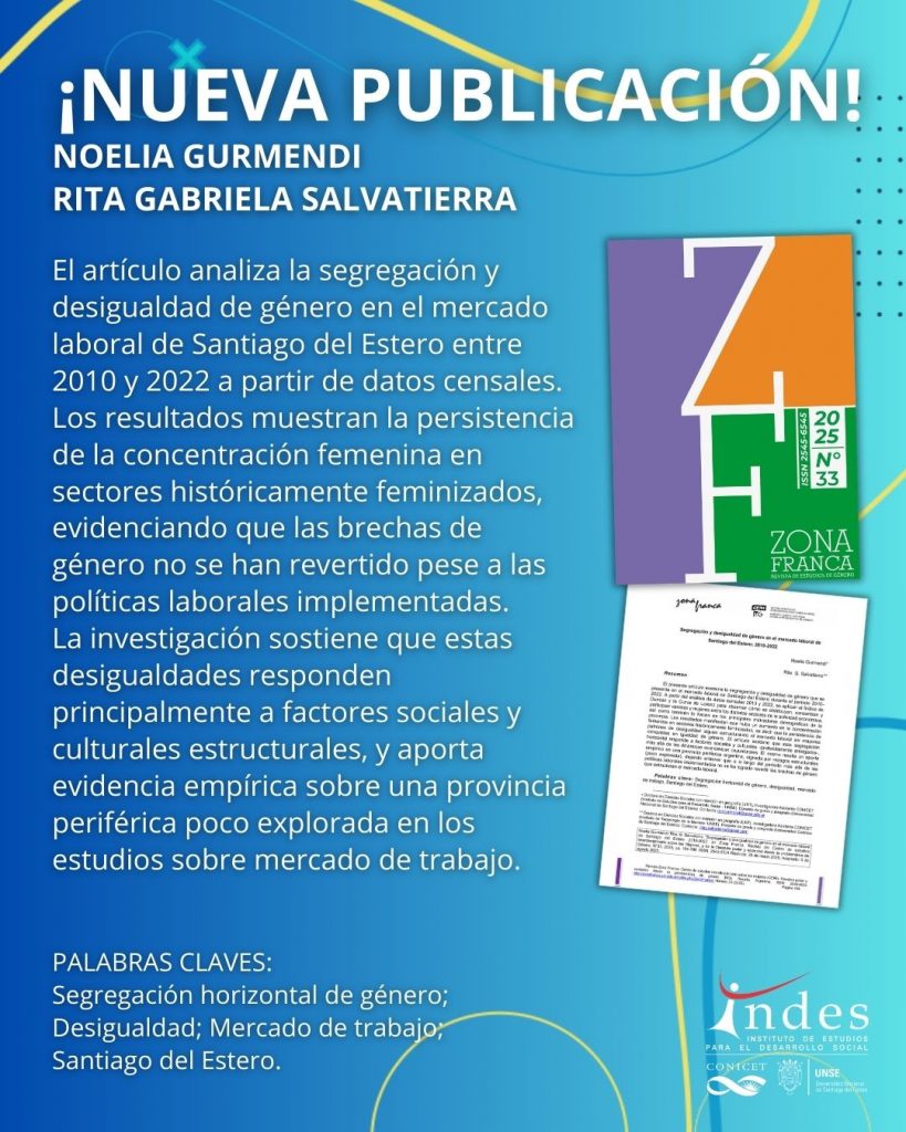 «El presente artículo examina la segregación y desigualdad de género que se presenta en el mercado laboral de Santiago del Estero durante el periodo 2010-2022. A partir del análisis de datos censales 2010 y 2022, se aplican el Índice de Duncan y la Curva de Lorenz para observar cómo se distribuyen, concentran y participan varones y mujeres entre los distintos sectores de la actividad económica, así como también lo hacen en los principales indicadores demográficos de la provincia. Los resultados manifiestan que hubo un aumento en la concentración femenina en sectores históricamente feminizados, es decir que la persistencia de patrones de desigualdad siguen estructurando el mercado laboral sin mayores conquistas en igualdad de género. El artículo sostiene que esta segregación horizontal responde a factores sociales y culturales -profundamente arraigados-, más allá de las dinámicas económicas coyunturales. El mismo resulta un aporte empírico en una provincia periférica argentina, signada por rezagos estructurales (poco explorada), dejando entrever que a lo largo del período más allá de las políticas laborales implementadas no se ha logrado revertir las brechas de género que estructuran el mercado laboral.»