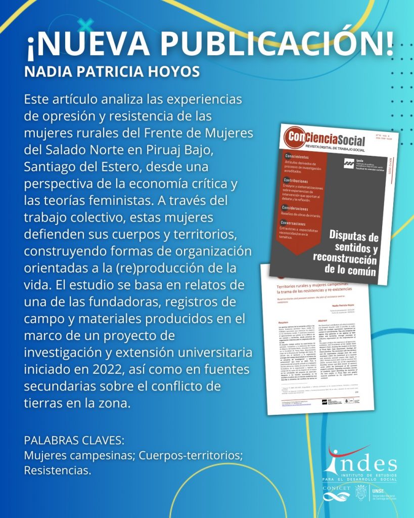 «Los aportes teóricos de la economía crítica y las teorías feministas permiten hacer visible las múltiples opresiones que vivencian las mujeres en los territorios rurales. Y asimismo reconocer el agenciamiento que gestan en la defensa de sus cuerpos y territorios, desde procesos de organización colectiva para la (re)producción de la vida. El presente trabajo analiza las experiencias de opresión, resistencia y re-existencia del Frente de Mujeres del Salado Norte, situando el análisis en la localidad de Piruaj Bajo, departamento Copo de la Provincia de Santiago del Estero. El vínculo con el territorio y la organización emergen del trabajo desarrollado en el marco de un proyecto de investigación y extensión universitaria que inicia en 2022. Para la construcción del presente artículo se emplearon fuentes primarias: relatos de una de las mujeres fundadoras de la organización y registros de campo de las voces de las mujeres en el marco de las actividades del proyecto de extensión. Respecto a las fuentes secundarias se ha acudido al análisis de un informe académico que describe la dinámica del conflicto de tierras en Piruaj Bajo y material gráfico publicado por la organización».