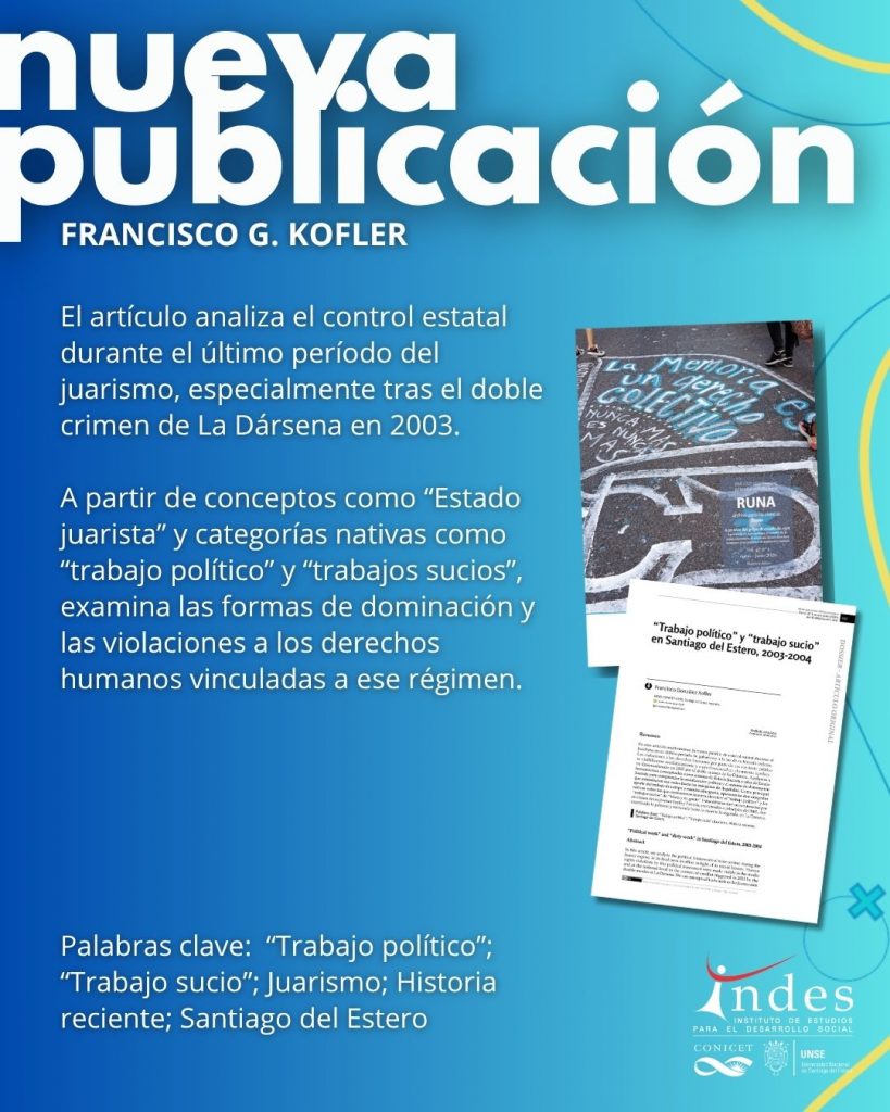 «En este artículo analizaremos la trama política de control estatal durante el Juarismo en su último período de gobierno y a la luz de su historia reciente. Las violaciones a los derechos humanos por parte de esa corriente política se visibilizaron mediáticamente y a nivel nacional en el contexto conflictivo desencadenado en 2003 por el doble crimen de La Dársena. Apelamos a herramientas conceptuales como sistema-de-Estado Juarista e idea de Estado Juarista para comprender la socialización política y el sistema de dominación que extendieron sus redes hacia los márgenes de ilegalidad. Como principal aporte del trabajo de campo a nuestra etnografía, aparecen las dos categorías nativas sobre las que centraremos nuestra atención: el “trabajo político” y los “trabajos sucios” de “Musa y su gente”. Estos últimos fueron condenados por el crimen de las jóvenes Leyla y Patricia, encontradas a principios del 2003, descuartizada la primera y torturada hasta la muerte la segunda, en La Dársena.»