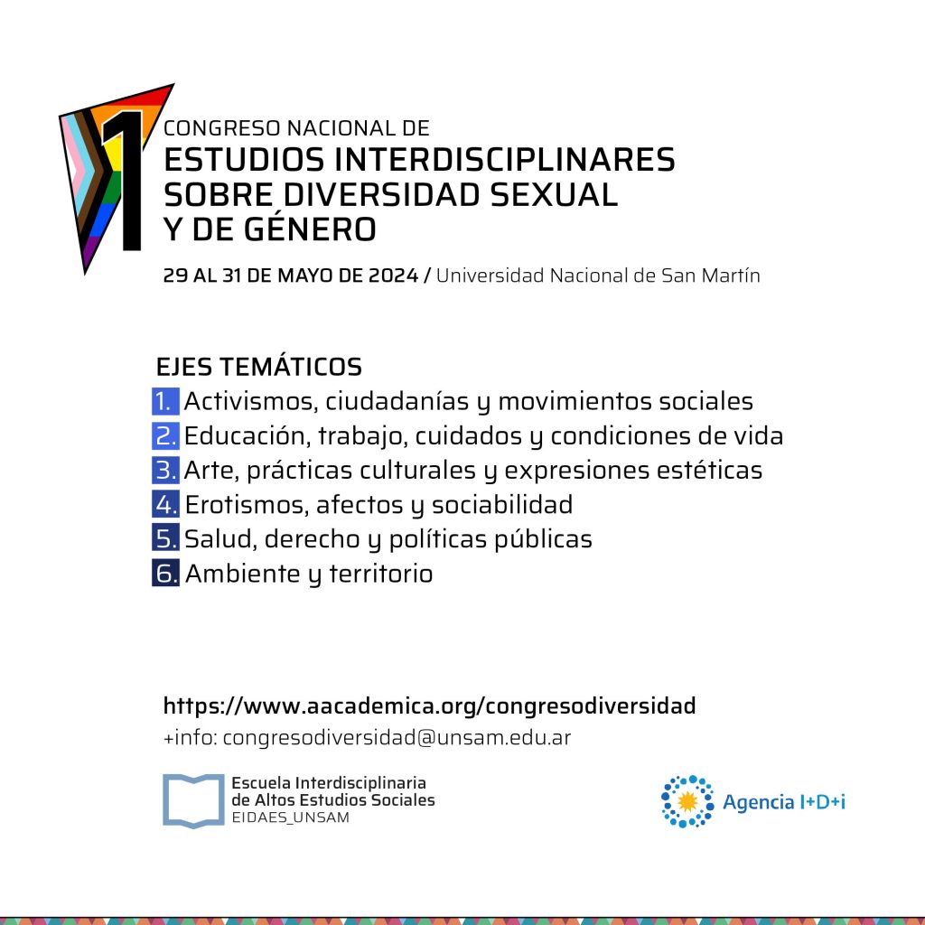 Queremos invitarlxs al Primer Congreso Nacional de Estudios Interdisciplinarios sobre Diversidad Sexual y de Género, que se llevará a cabo del 29 al 31 de mayo de 2024 en la Universidad Nacional de San Martín. Buscamos reunir profesionales y estudiantes en diferentes etapas de formación, provenientes de distintos campos disciplinares, enfoques metodológicos y zonas geográficas del país, así como también activistas, organizaciones no gubernamentales e instituciones del Estado vinculadxs a la población LGBTI+.